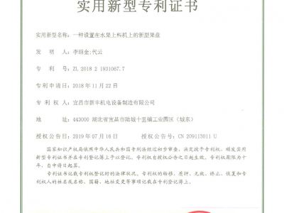 實(shí)用新型專(zhuān)利證書(shū)《一種設(shè)置在水果上料機(jī)上的新型果盤(pán)》