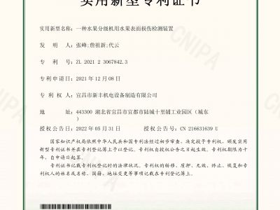 實(shí)用新型專(zhuān)利證書(shū)《一種水果分級(jí)機(jī)用水果表面損傷檢測(cè)裝置》