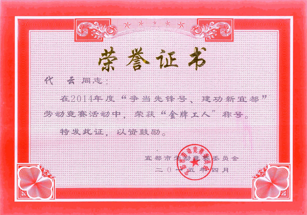 宜昌市新豐機電公司技術(shù)部長代云同志,在2014年度“爭當(dāng)先鋒號、建功新宜都”勞動競賽活動中,經(jīng)宜都市勞動競賽委員會評選為“金牌工人”榮譽稱號。